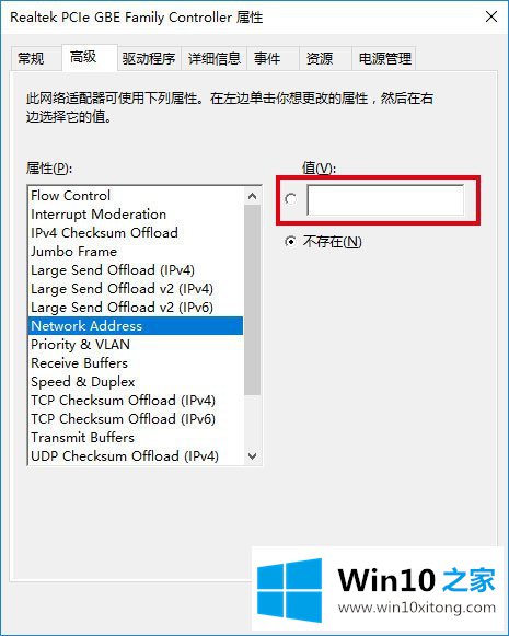 2、在"高级"选项卡中,查看是否有"Network Address"、"MAC Address"或"网络地址"等内容;