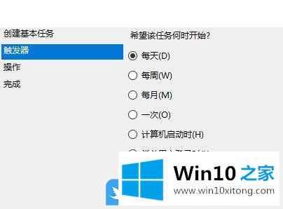 5、触发器,选择时间,可以是每天,每周,每月等,大家根据自己的情况,选择即可;