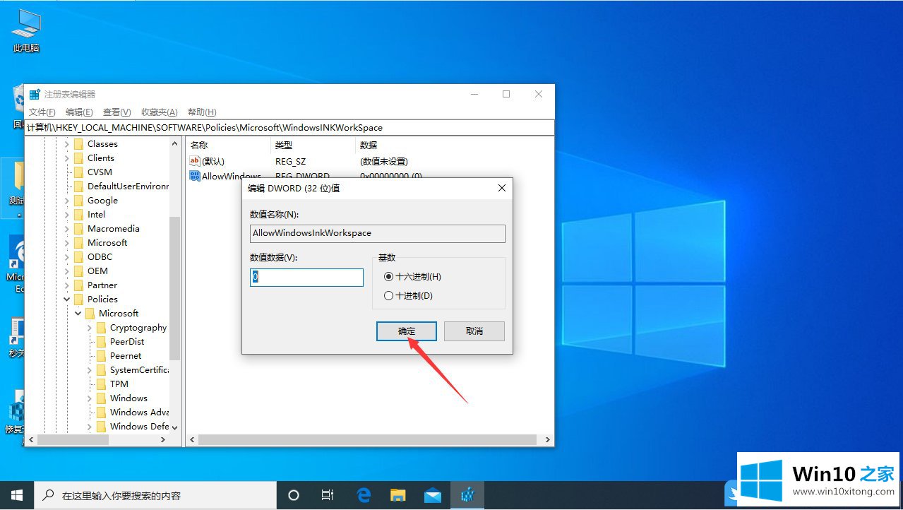 5、最后,修改AllowWindowsInkWorkspace,然后在打开的编辑 DWORD (32 位)值窗口中,修改数值数据为0,修改完成后,记得重启电脑;