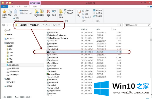 5.此时,您可以在系统磁盘文件夹Windows/system32中找到cmd.exe文件。或者在开始菜单中,找到所有程序附件的命令提示符图标。