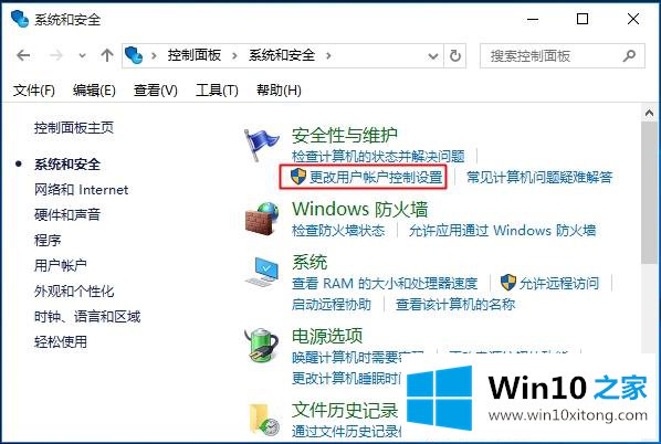 2.或者右键单击开始按钮-控制面板-系统和安全,然后单击“更改用户帐户控制设置”;