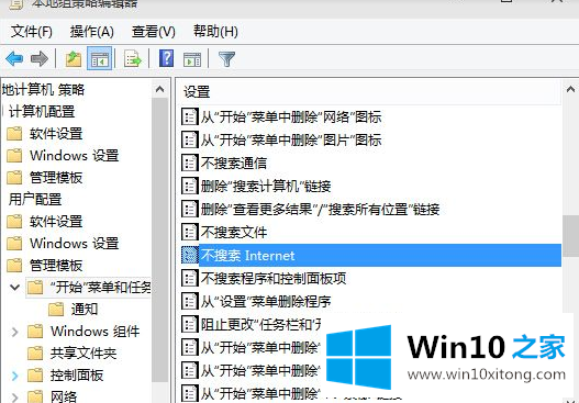 3.在右侧列表中找到“不搜索互联网”选项,双击打开,设置为“已启用”;