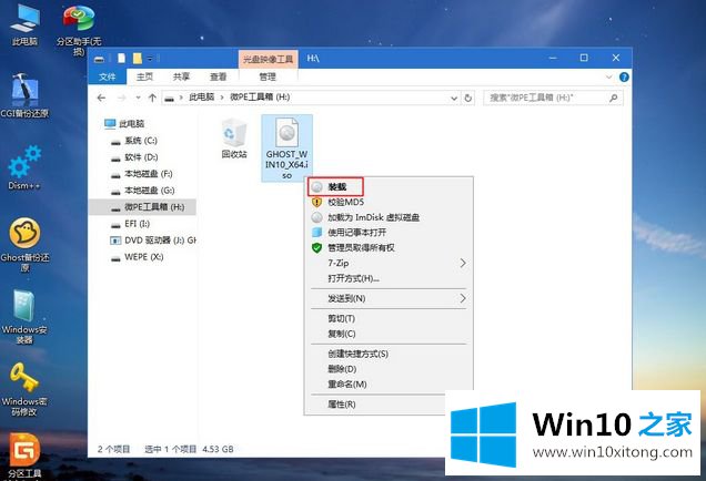 7.然后打开这个pc-micro PE工具箱,右击win10系统的iso映像,选择【加载】。如果没有加载选项,右键-打开方法-资源管理器;