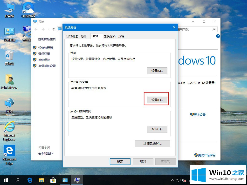 4.选择“高级”选项按钮,并选择用户配置文件下的“设置”选项按钮。