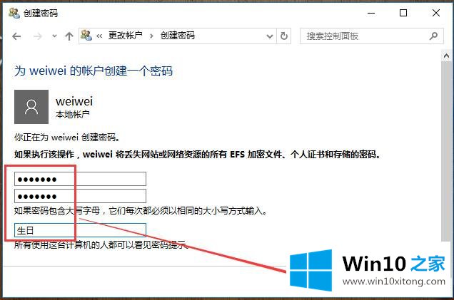 03.在对话框中,输入两次相同的密码,并设置密码提示后,单击“创建密码”按钮,如图所示。