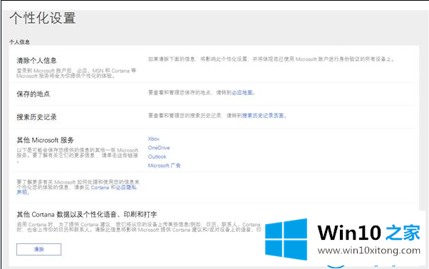 4.消除网页中“其他Cortana数据信息及其人性化视频语音、包装打印、电脑打字”的选项,进而消除云端存储的隐私保护数据信息。