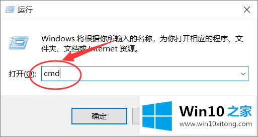4.win10系统电脑开机后,点击键盘上的win r键,在打开的运行窗口中输入“cmd”,点击“确定”按钮。
