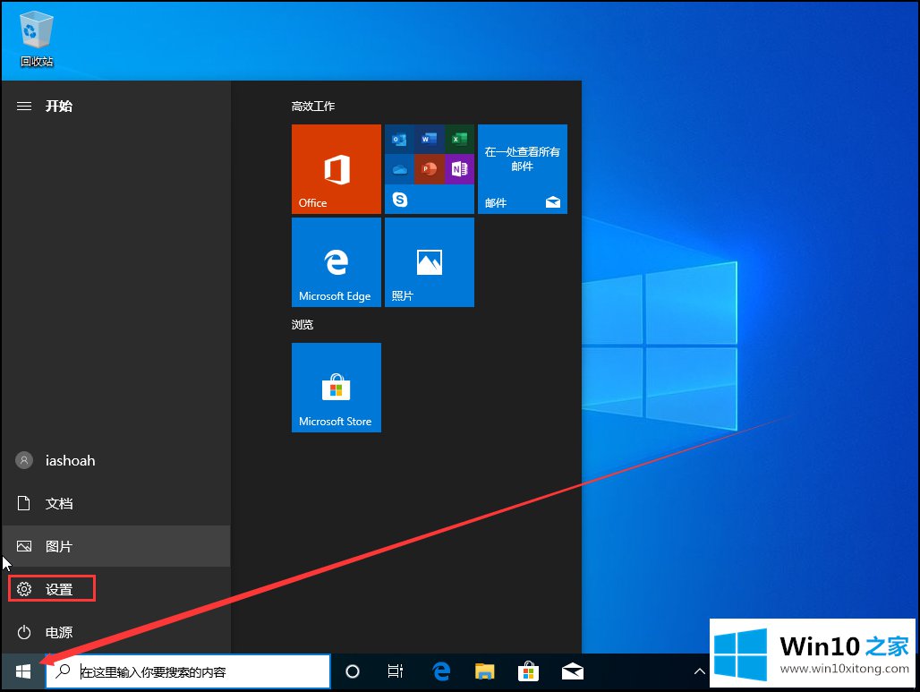 1.win10 1909系统计算机打开后,单击桌面左下角的“开始菜单”图标,然后单击“设置”。