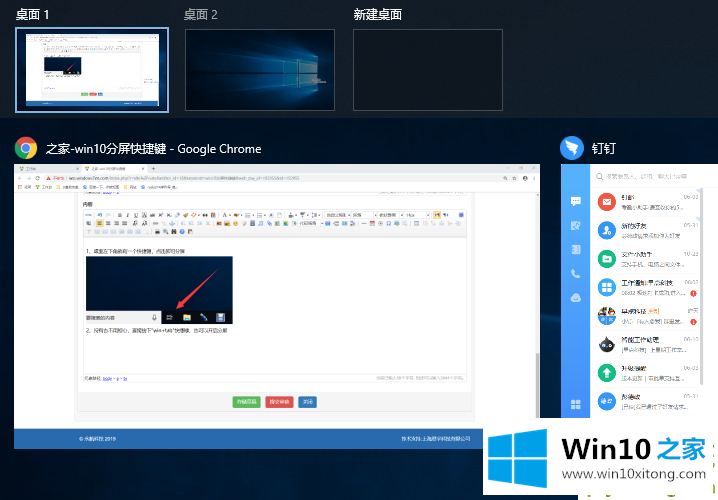 5、没有也不用担心,直接按下"win+tab"快捷键,也可以显示当前运行的程序,选择需要分屏显示的程序,点击“左侧贴靠”或“右侧贴靠。桌面不够用还可以新建桌面进行切换哦