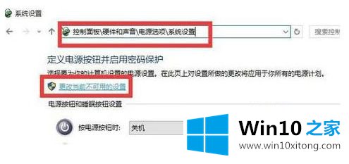 2.从打开的“控制面板”界面,依次进入“硬件和声音”——“更改电源按钮功能”界面,点击“更改当前不可用设置”按钮。