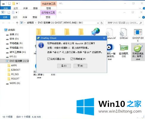 8.双击【双击安装系统。运行安装工具,选择[恢复分区],GHO WIM ISO镜像路径会自动提取到win10.gho,然后选择安装位置,通常是c盘,或者根据卷标或者总大小来判断。选择后,点击确定;