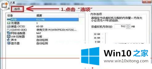 2.点击“编辑虚拟机设置”,弹出新窗口,点击“选项”;