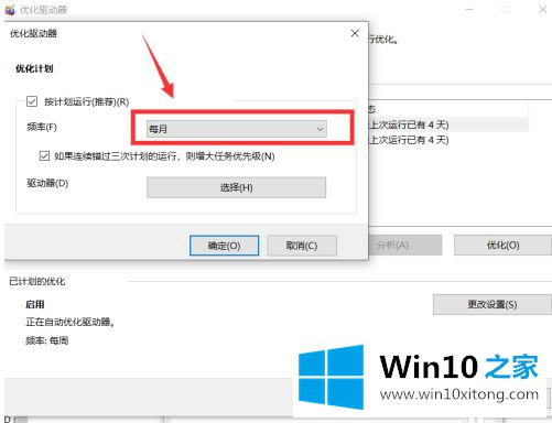 4.在弹出的页面中,点击“工具”选项,点击“优化”按钮,在页面中找到“计划优化”,点击右边的“更改设置”选项,然后选择每月一次,点击确定。