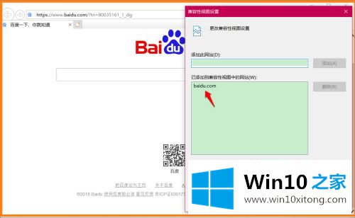 6.此时,将打开兼容性视图设置对话框。我们可以看到添加这个网站的栏目里有一个:Baidu.com(百度)。您可以单击[添加]将此网站添加到兼容性视图中的网站;