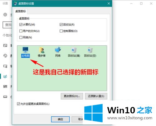 5.默认情况下,Win10使用带有尖锐棱角的平面图标。很多习惯了伪对象风格图标的朋友可能会觉得不舒服。如果不喜欢系统默认图标,也可以改成自己喜欢的图标。方法是点击“更改图标……”在桌面图标设置窗口中。