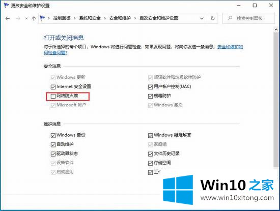 4.最后,取消安全消息栏中的“网络防火墙”。