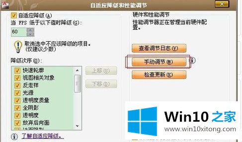 2、将自适应降级勾选。 当FPS低于60时降级(FPS默认值是5)。