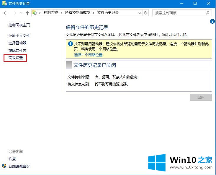 3、我们会发现文件历史记录功能是默认关闭状态。要打开它,先点击启用(事先要插好U盘),连接好后再次点击开启,系统文件就被自动保存到了U盘或者移动设备上,文件备份功能可以自动备份库、桌面、收藏夹、联系人等内容,所以大家就可以将重要文件放置在上述文件夹中。除此之外在左侧的"高级设置"中还可以对保存频率等进行设置,设置保存文件的时间间隔,这样相对来说比较人性化一点。