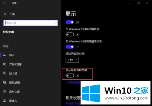 5.显示界面找到显示桌面的背景图像,这个开关实际是关闭的;