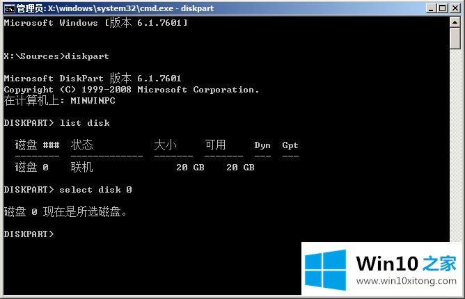 4、输入:select disk 0,回车,选择第0个磁盘(电脑的硬盘编号是从0开始的);