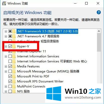 2、打开“启用或关闭 Windows 功能”后,会发现“Hyper-V”是处于开启状态的。