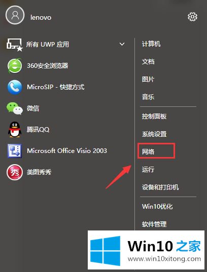 1、首先我们在电脑桌面找到左下角的开始图标,点击打开开始菜单,然后在菜单右侧的目录中,找到网络选项,进入网络共享中心窗口,在窗口中找到以太网选项