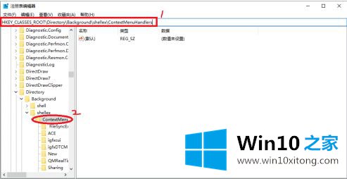 2、打开注册表编辑器,在输入框内复制下面的路径HKEY_CLASSES_ROOT\Directory\Background\shellex\ContextMenuHandlers并回车,如果复制路径找不到的话我们可以按照路径在左侧依次打开