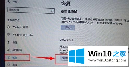 3、紧接着在新弹出的窗口左侧选择【恢复】。然后再在右侧的“高级启动”下方选择【立即重启】。