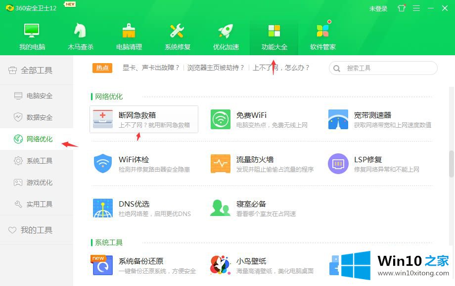 3、使用 360安全卫士功能大全中的网络优化 - 断网急救箱来检测电脑上的网络配置问题进一步修复。一般使用该工具修复后会要求重启计算机。