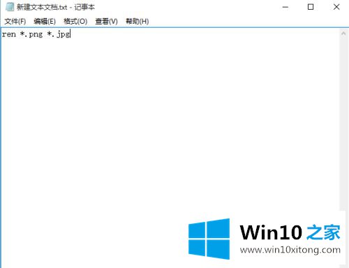 3、打开刚刚新建的txt文档,输入ren *.png *.jpg。这里稍微解释下:Ren 空格 星号 点 需要修改的文件后缀名 空格 星号 点 需要改成的文件后缀名。