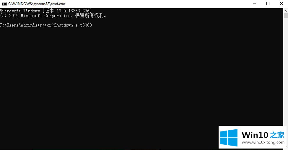 2、接着下页面中输入Shutdown-s-t3600,然后按回车键,3600代表着是秒。